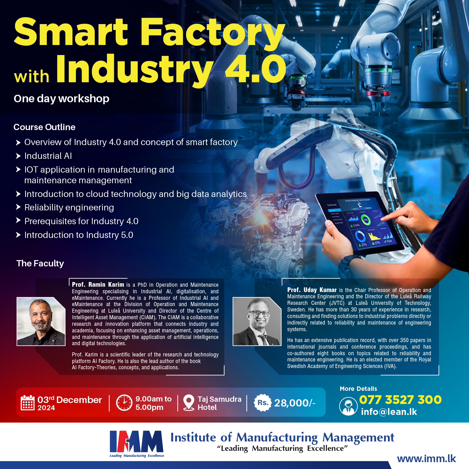 Course Outline Overview of Industry 4.0 and concept of smart factory Industrial AI IOT application in manufacturing and maintenance management Introduction to cloud technology and big data analytics Reliability engineering Prerequisites for Industry 4.0 Introduction to Industry 5.0 9.00am to 5.00pm 03/12/2024 Thaj Samudra Hotel 28000/-